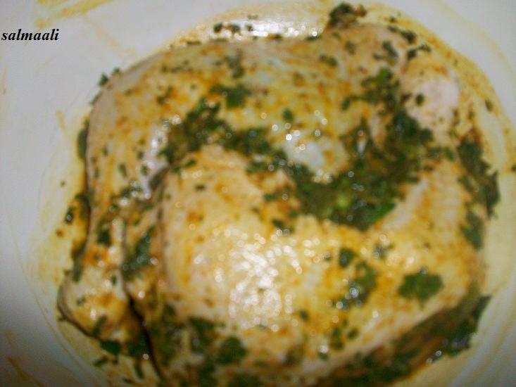 دابا سخن الحال أكانبغيو أطباق خفيفة وصيفية بغيت نشارككم بعشيوتي البارح خذيت الدجاج شرملتو بملح+إبزار+سكنجبير + قزبر يابس+ ثومة محكوكة + قزبر ومعدنوس مقطع رقيق + عصير نصف حامضة + شوية تحميرة + خرقوم بلدي +3الملاعق كبيرة زيت بلدية نشرملو الدجاج ونخليو تقريبا واحد ساعتين فالثلاجة من بعد نفوروه مني يطيب ندهنوه بالزبدة ولاموطارد وندخلوه إتحمر