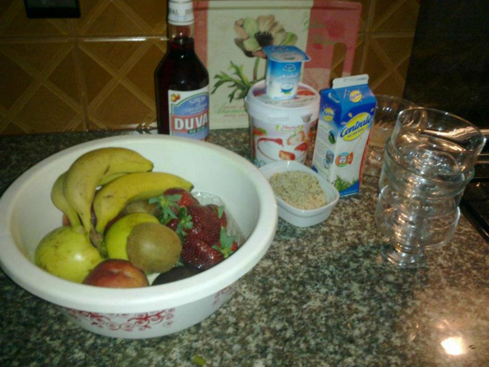 والحليب و دانون طبيعي و السرو الاحمر و الفواكه الجافة مهرمشة نقطع الفواكه