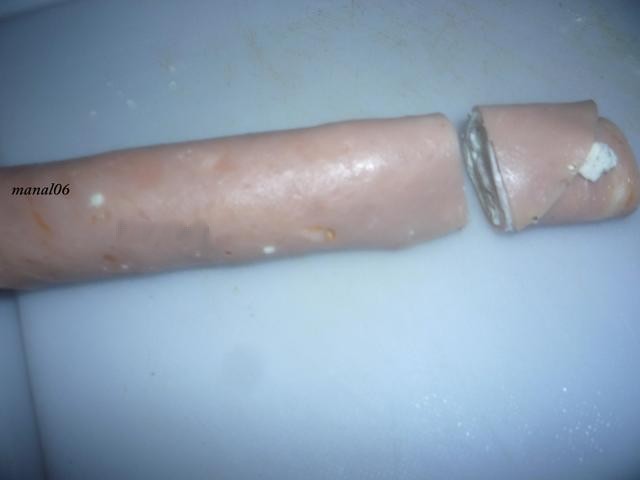ملفوف شرائح الديك الرومي المدخن بالفرماج :نحتاجو ليه ؛ شرائح الديك الرومي+فرماج بالتوم للدهن+فرماج بالاعشاب المنسمة+عويدات