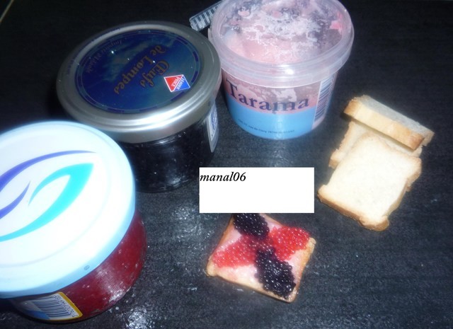 مقبلات ببيض السمك : نحتاجو ليهم؛بيض السمك الاسود والاحمر+صلصة السمك المدخن+خبز الطوست بحجم صغيركل هاد العناصر كاتباع فالاسواق التجارية الكبرى