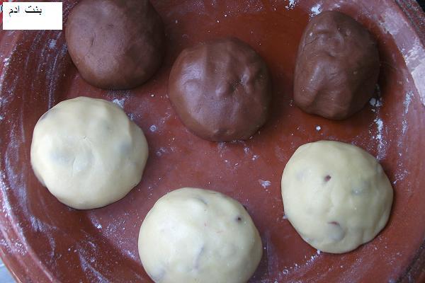 يخدم البيض مع سنيدة تم الزيت لوز وخمارات مع اضافة الدقيق شوية بشوية ختى تجمع العجين و نحصل على كورة من لعجين تقسم على 2 كورة تترك هكاك وكورة يضاف لها الكاكاو