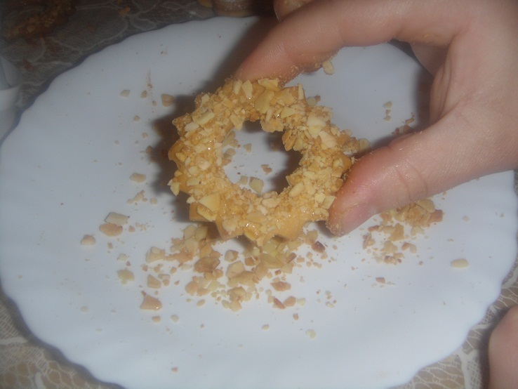 هذا الشكل ندهنه بالمربى ثن نمرره في اللوز ثم نلصق واحدة مع الاخرى