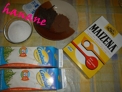 نخلط نصف لتر حليب مع الكاكاو السنيدة والنشا ونعمله على نار متوسطة حتى يغلي عاد نزيد الشكلاط ونخليه حتى يتختر الخليط