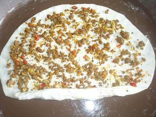 بصلة مشلظة+فلفلة حمراء وخضراء مقطعين+خيزو محكوك غليظ+كفتة+معدنوس