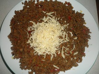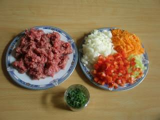 بصلة مشلظة+فلفلة حمراء وخضراء مقطعين+خيزو محكوك غليظ+كفتة+معدنوس