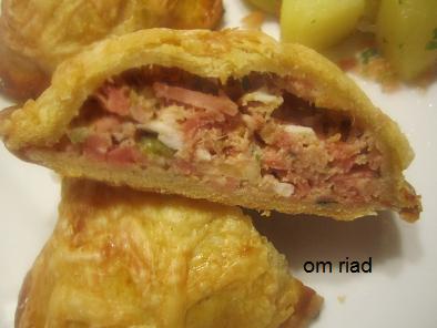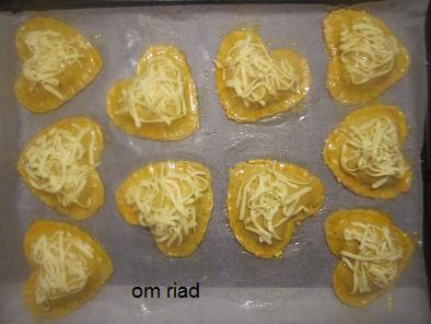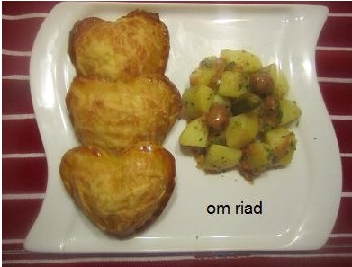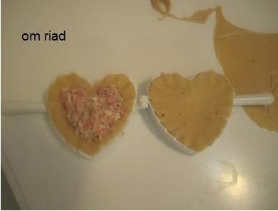 يطلق العجين بالمدلاك بحيث يكون سمكه رقيق جدا تقريبا 1mm و يقطع حسب الرغبة أي دوائر أو مربعت أو مستطيلات أو ……. و نضع قيل من الحشوة ثم نتني العجين أو نغطيه بقطعة أخرى من العجين و نضغط عليه بالشوكة من الجوانب أو نستعمل قولب الشصون أنا استعملت قالب على شكل قلب بعد ذالك نتك الشطون بإبرة و نذهنه بالبيض و نرشه بالجبن و يطهى في فرن معتدل الحرارة تم يقدم بالصحة و العافية