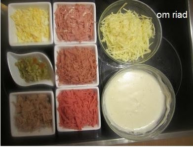 في إناء نقوم بخلط كل من الكاشير + التون + الفرماج + البيض + الزيتون + المعدنوس جيدا حتى تندمج العناصر مع بعض تم نضيف صلصة البيشاميل و نمزج الكل جيدا