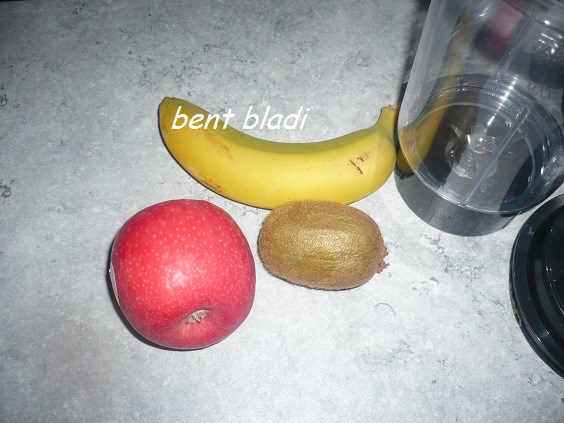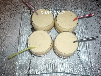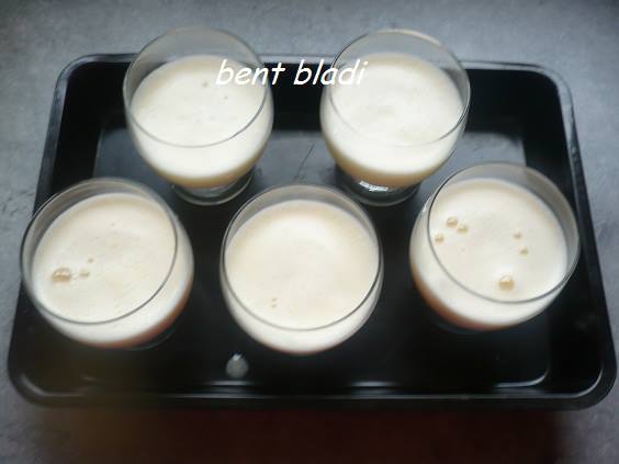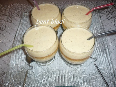 عند التقديم كنطحنو الفواكه،سكر ولحليب ونصبوه فوق الطبقة الاولى