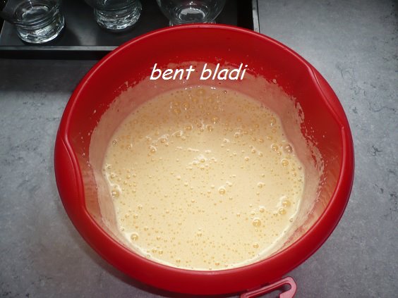 نخفقو البيض،سكر ،لفاني وقشور الحامض حتى يبيض اللون ديالو