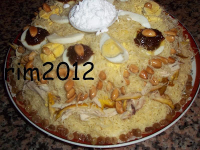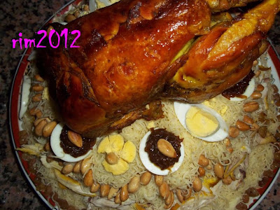 ونقدموها نعملو السفة +الدجاج مفتت +اللوز مفسخ ومقلي ومهرمش +السفة ونزينوها بالبيض معمر بعقدة البصل واللوز ونزلو الدجاجة المحمرة من الفوق