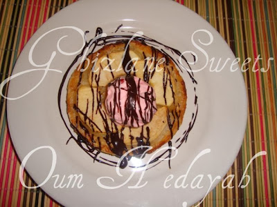 *عند التقديم اضفت عليه مثلج الفراولة و زينته بخطوط الشوكولا