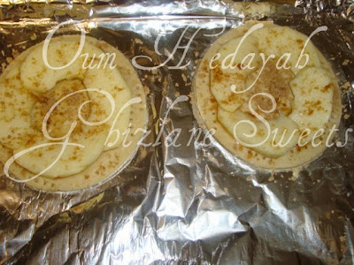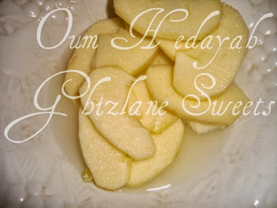 نرش العجين بالسكر تم نضع عليه التفاح و نرشه مرة اخرى بالسكر انا هنا عملت السكر البني يمكن تعملو حتى الابيض