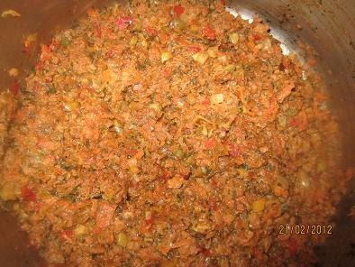 مقادير الحشوة : 250 كفتة البقر+2 بصيلات مشلضين+1/2فلفلة حمرة و خضرة وصفرة مقطعة مربعات صغار+2 جزر محكوك غليض+3 م ك معدنوس مقطع رقيق+قليل من زيت الزيتون و زيت المائدة+ملح+تحميرة+كمون+إبزار+عطرية ديال الكفتة (إختياري)+10 حبات زيتون أخظر مقطع رقيق+جبن مبشور +بيضة