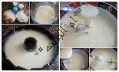 كنفرغوا الكيك فاناء و نضيف الخميرة و الدقيق معلقة معلقة حتى كتحصلوا على الكثافة المناسبة للكيك العادي