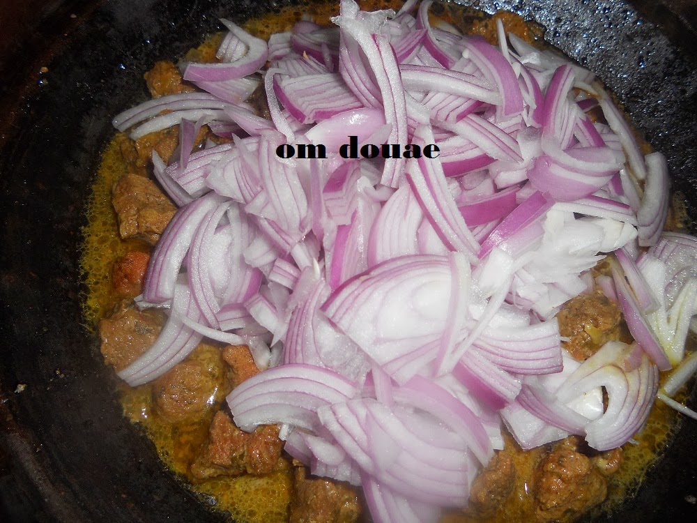 اولا شديت الحم قطعتو طريفات بحال اللي غاديا نصايبو قطبان رقدتو فليقامة ابزار ملح سكين جبير خرقوم ربيع مقطع ثوم محكوكة زعفران حر شوية ملون شوية ليقامتي الخاصة باللحم اللي تتبنن الاكل مممم ههه بصلة مشلظة خليتهم باتو فثلاجة فصباح حطيتهم فطاجين خليتهم تقلاو مزيان عاد زدت ليهم شوية زيت العود بصلة شرائح