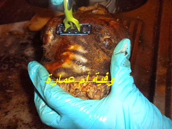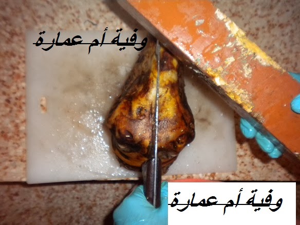 المهم من بعد كنخرج المخيخ هههه وكنزيد نقسمو من مكان الفك يعني تيولي الراس مقسوم على 4 ، كين الناس لكيدروه على جوج وحنا في الدار كنقسموه على 4