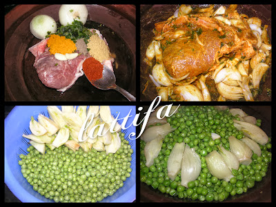 المهم نشرملو لحم بالبصلة والتوابل ونخليوو نصف ساعة ونزيدو نصف كاس زيت ونخليه يتقلى ربع ساعة ونزيد الماء طايب ونغطي الطاجين ونخلي لحيمات ياخدو وقتهم في طياب من بعد نحط الجلبانة والبسباس والزيتون ولمصير ونغطي الطاجين يطيب مرة مرة نراقب البويون باش ما يتحرقش لينا انا كنضيف ماء ساخن الا احتاجيت