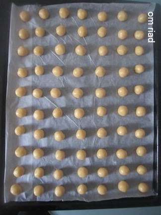 نصنع من العجين كويرات صغيرة متساوية الحجم تصفف في طاوة و تطهى في فرن معتدل الحرارة غير تورد و نزولها منخلوهاش تحمر بزاف