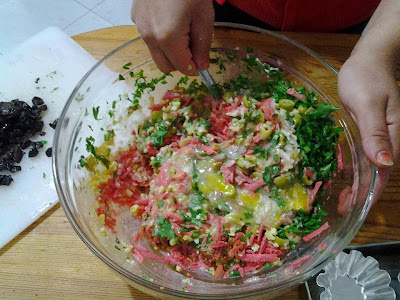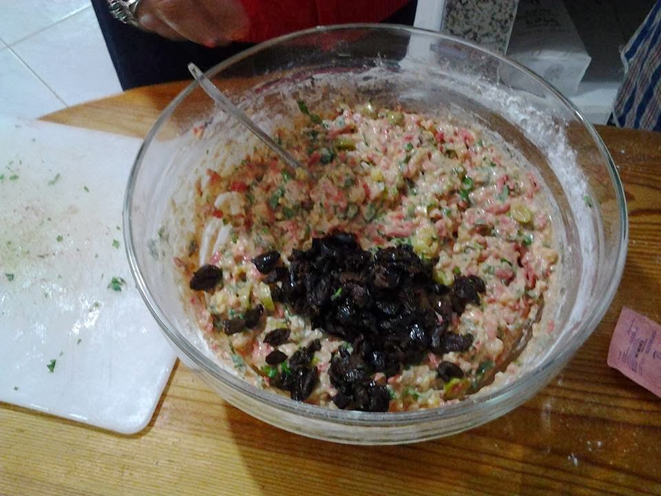 وأخيرا نضف الزيتون الأسود ونخلط بشوية باش ميتوسخش الخليط