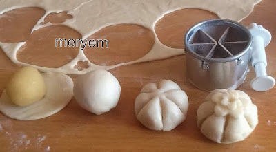 دأبا هاد الشكل سميتو الثويمة أنا كنس تعمل المرشم نتاعو اللي معندهاش تحاول تعمل دوك الشرطات غير بالسكين غير هو حاولو ما أمكن باش ايجيو مقادين هاد المرشم تنحدد بيه ومن بعد تنزيد نفلحهم المهم نعملو دائرة من العجين نضع كويرة من العقدة نجمعو الأطراف باش نديرو كرة هاداك الشي اللي جمعناه هو اللي أيكون التحت باش مايبانش التكماش من الفوق ورآه مصورة الطريقة بالتفصيل