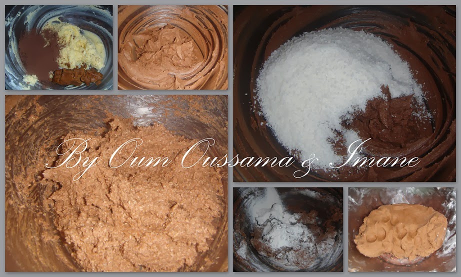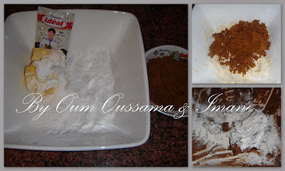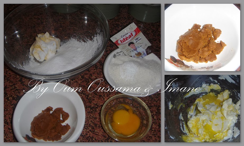خدمت الزبدة مع السكر والفاني ثم ضفت الكاوكاو مطحون وخلطت مزيان ثم ضفت الدقيق