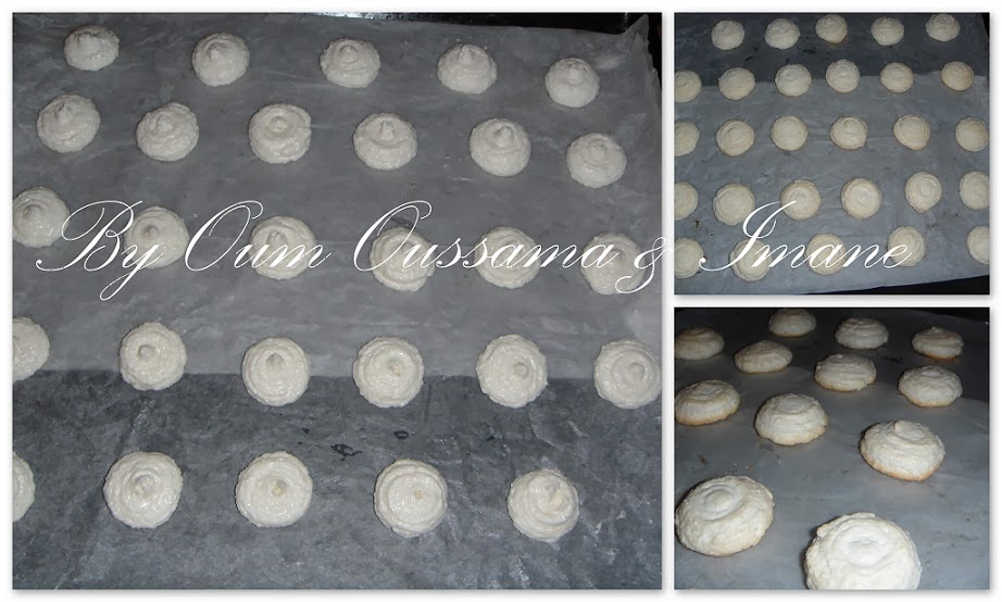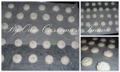 نضع الخليط في جيب الحلواني ونشكله مثل الماكارون ونضغط على الرأس وندخله لفرن مسخن مسبقا على 160 درجة