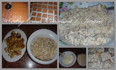 مقاديرها : شوية الفواكه الجافة حسب المتوفر + كورن فليكش مشكل فيه الخرطال وانواع أخرى من الحبوب وممكن إستعمال الكورن فليكس العادي + شكلاط أبيض