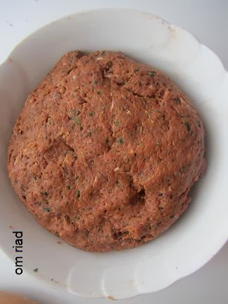 نتبل الكفتة بالبصل و المعدنوس و النعناع و العطرية ديال الكفتة و القصبر حبوب و الكامون و التحميرة و الملح و 1 م ك زيت العود و تخلط جيدا و تترك على الأقل 2h