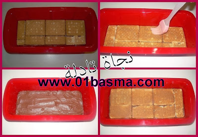 وضعت البسكوي سقيتو بالقهوة ثم طبقة من موس الشكلاط ثم باقي الطبقات بنفس الطريقة