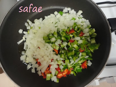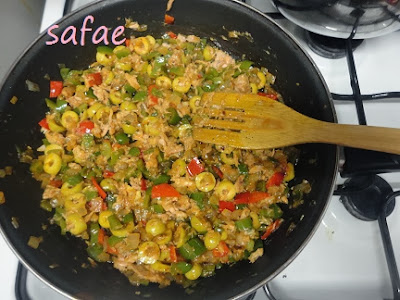 2 ـ ناخدو مقلاة و نديرو فيها شويش ديال الزيت و نشحرو فيها البصلة مع الفلفة خضرا و حمرا ملح و ابزار , من بعد ما يتشحرو و ينزلو شويش نضيفو الصوص طوماط و نطفيو عليهم , ز نزيدو الطون مع الزيتون و نخلطو الكل و نخليو الحضوة على جنب تبرد شويش .