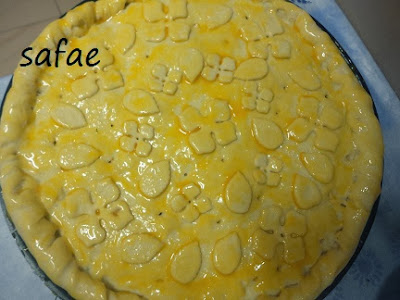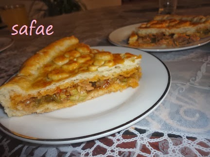 4 ـ نوضعو الحشوة من فوق العجين لي عندنا فلاطة , نطلقو النصف المتبقي من العجين و نغطيو به الحشوة نزولو الشايط و جمعو العجينة التحتانية مع العجينة الفوقانية و حنا كنقرصو فيها باش ماتخرجش الحشوة , و بالنسبة للعجين لي شاط نطلقوه و نقطعوه بقطاعات الشكل لي بغينا و نزينو به من الفوق , ندهنو بالبيض و نديرو تقيبات فالخبيزة بقطيب ديال الشوا و ندخلوها الفران حتى طيب و تحمر و بالف صحة و عافية