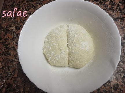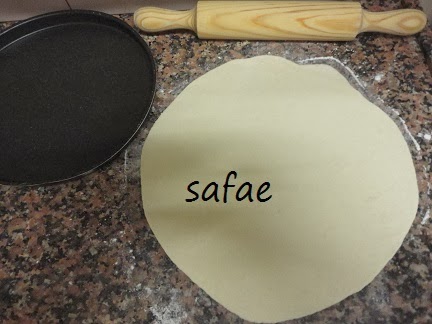 3 ـ من بعدما خمرات العجينة ناخدوها و نقسموها على 2 و نطلقو الكورة الاولى بالمدلك على شكل دائري او حسب الشكل لي بغيتو لازم تكون العجينة رقيييقة و نديروها فلاطة ( انا استعملت لاطة ديال البيتزا ) .