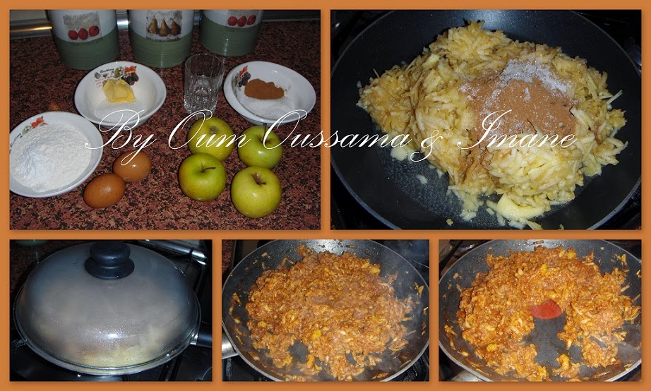 اولا نعمل التفاح محكوك في مقلات ونضيف السكر والماء والقرفة ونخليه يطيب حتى ينشف