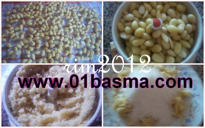 1/2 كلج لوز مفسخ ومنشف جيدا ومطحون مرتين الاولى لوحده والثانية مع 250ج سكر