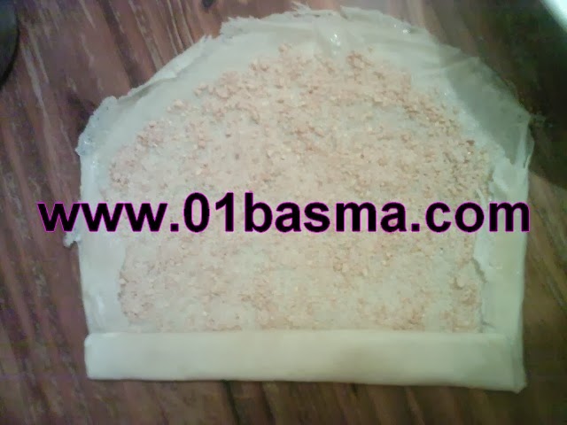 نأخذ 2 ورقات من اوراق البسطيلة واحدة فوق الاخرى و ندهن الاخيرة بالزبدة ونرش تقريبا ملعقتان كبيرتان من خليط اللوز
