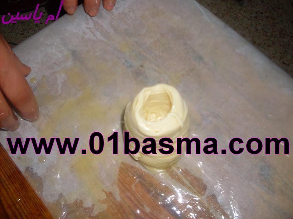 ناخد وحدة ونحلها وندوزها فالمكينة مين يخرجو لخيوط نلويها على المدلك أورشها بالزبدة أوزيت حتى لويها كاملة مين يخرجو لخيوط لخرين نضغط عليهم بيدي