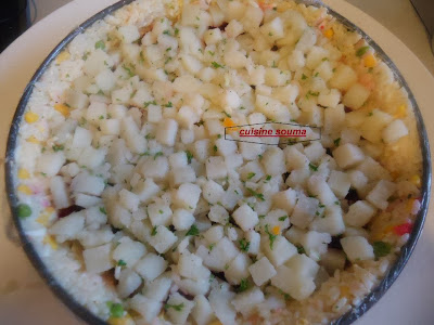 نضع طبقة البربا ثم طبقة البطاطس وأخيرا طبقة الجزر