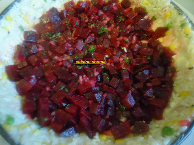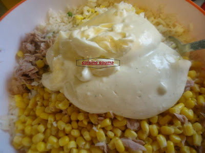نخلط مقدار كأس مايونيز وملعقة خردل +فلفل أسود+ملح+عصير الحامض+نضيف قليل من الزيت مع التحريك جيدا نضيف هذا الخليط على الارز المسلوق ونحرك جيد ونتركه جانبا