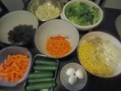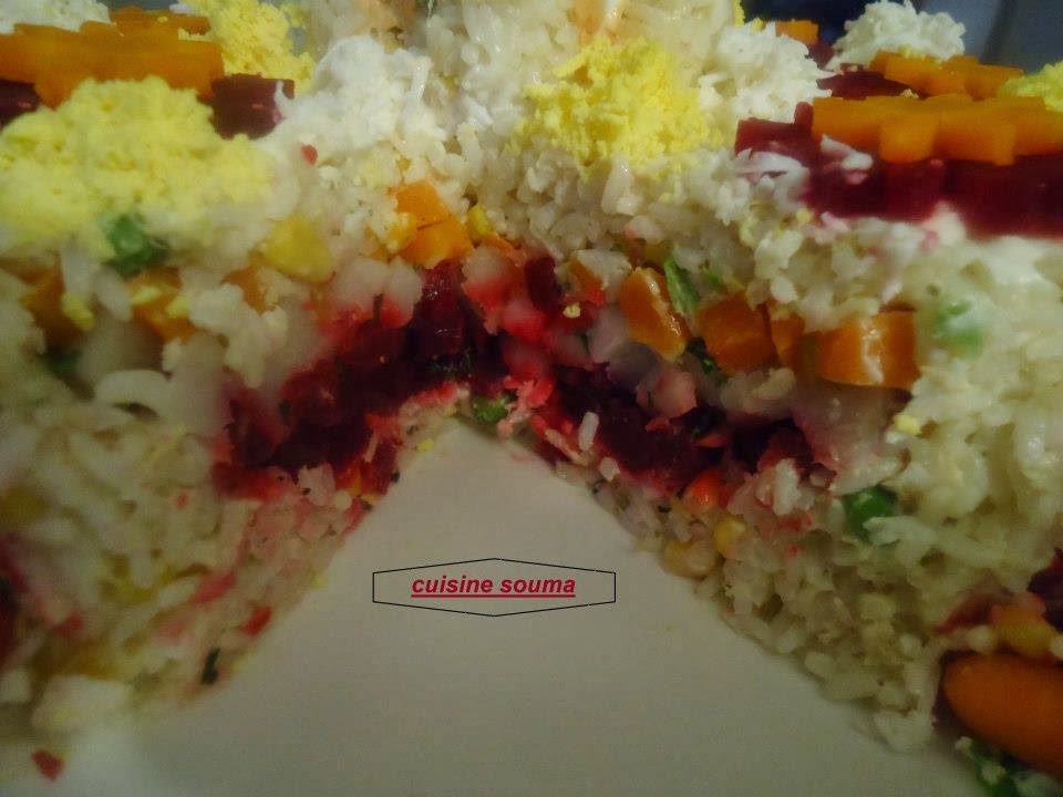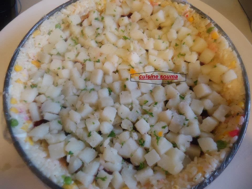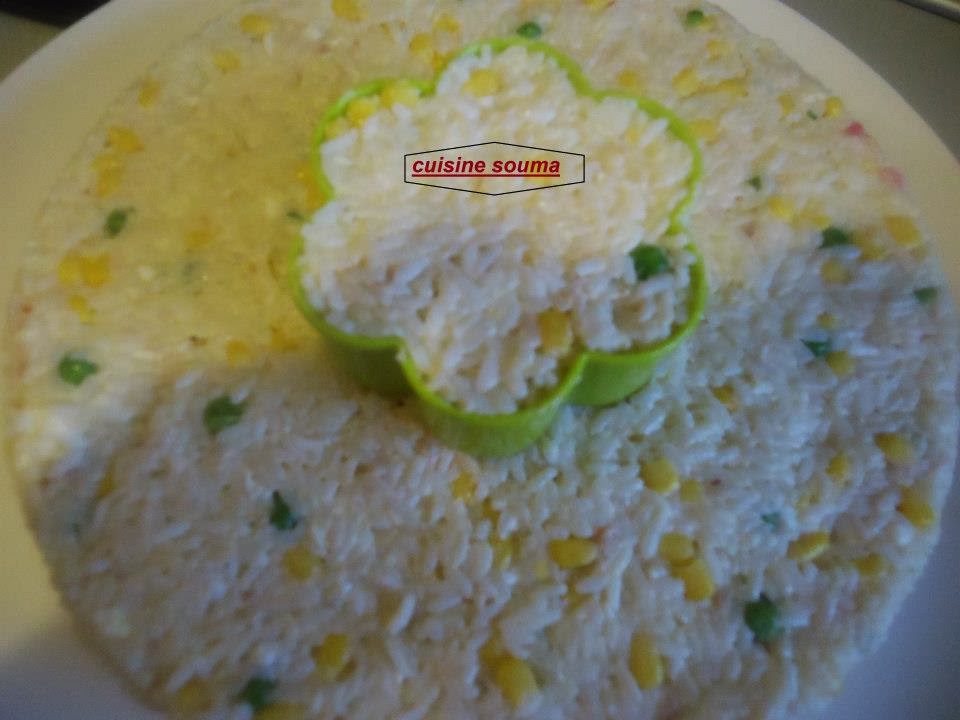 نخلط مقدار كأس مايونيز وملعقة خردل +فلفل أسود+ملح+عصير الحامض+نضيف قليل من الزيت مع التحريك جيدا نضيف هذا الخليط على الارز المسلوق ونحرك جيد ونتركه جانبا