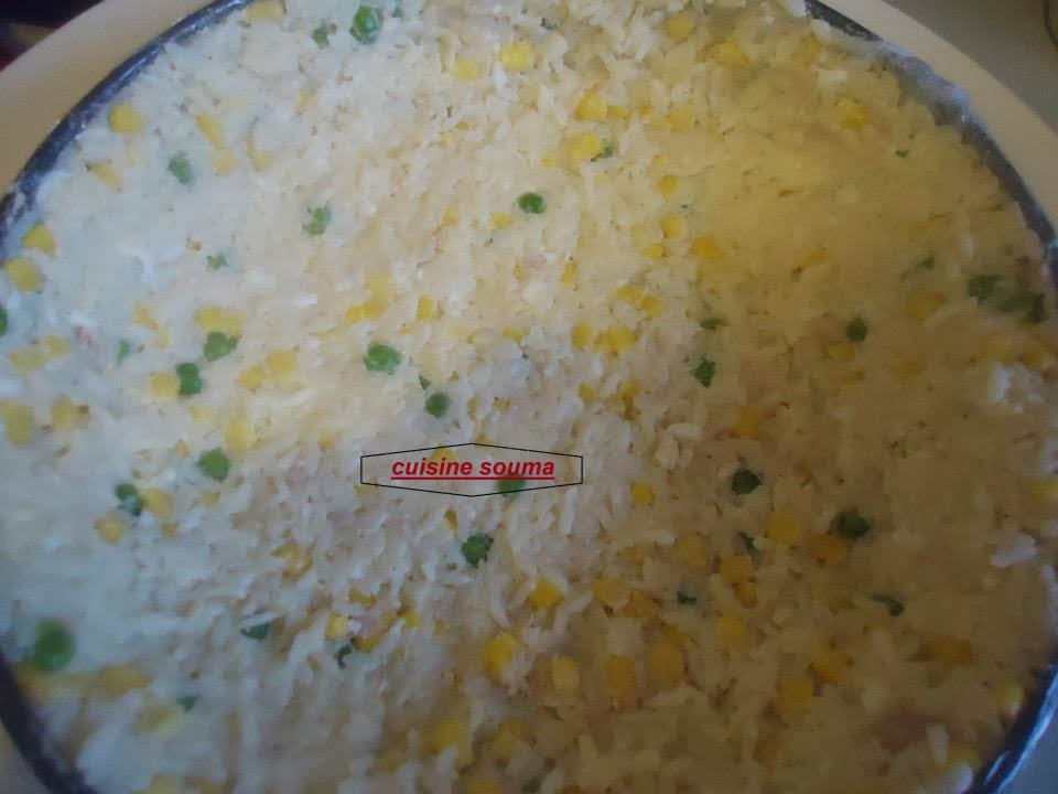 ناخذ الرز المسلوق نضيف إليه كل من التونة وعلبة الدرة+وبيضتان محكوكتان