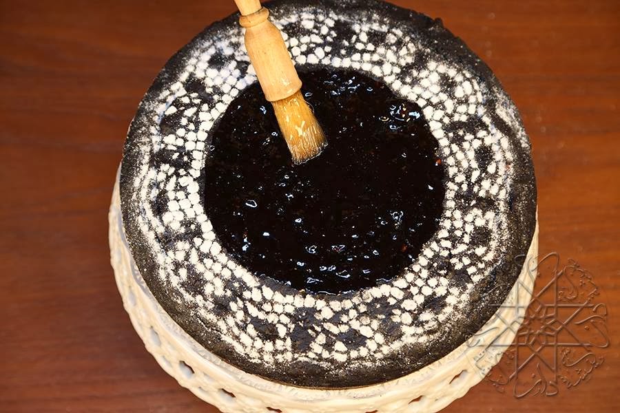 تخرج الحلوى من الفرن وتترك تبرد تماما قبل إزالتها من القالب.يوضع ورق دانتيل فوق الحلوى وترش بالسكر الناعم.