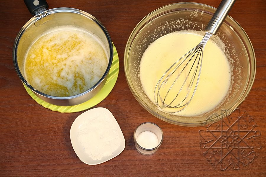 :يمزج البيض مع السكر الخشن، سكر الفانيلا، الملح والزبدة حتى يذوب السكر.