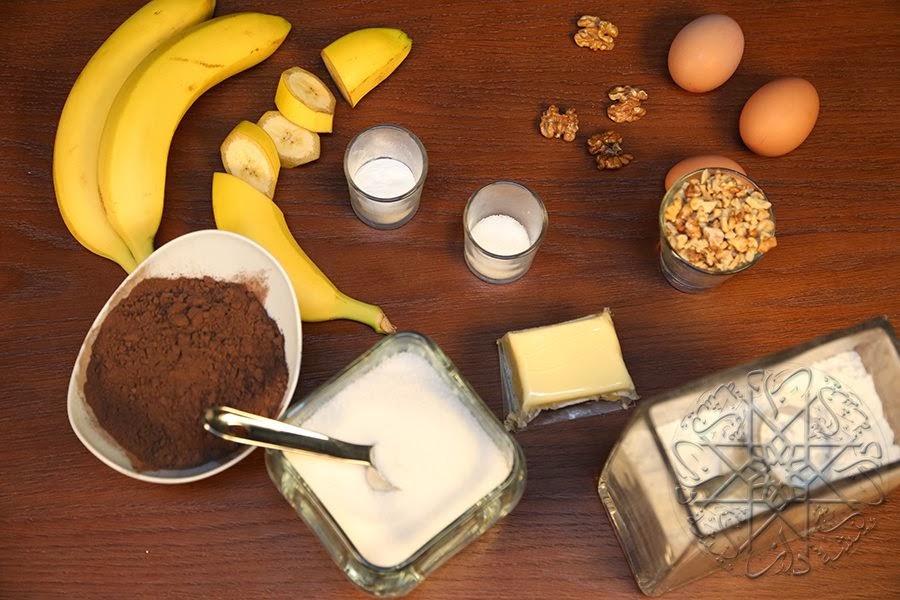 يضاف الموز الممعوك والجوز المجروش مع التحريك ليتمازج الكل مع العجين.