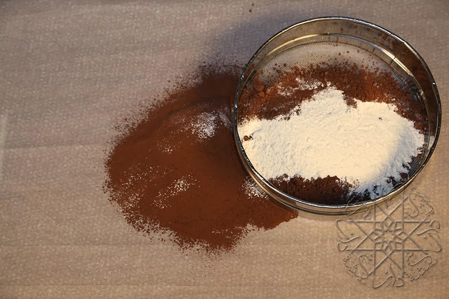 ينخل الدقيق مع مسحوق الكاكاو والخميرة. يضاف الكل إلى خليط البيض/السكر/الزبدة ويمزج للحصول على عجين متجانس.