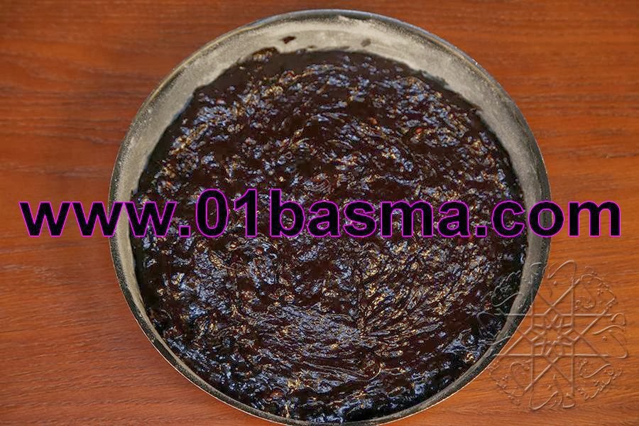 تصب العجين في قالب مدهون بالزبدة ومرشوش بالدقيق قطره 24 سم. ويدخل إلى الفرن المسخن على درجة الحرارة 180 لمدة 40 إلى 45 دقيقة.