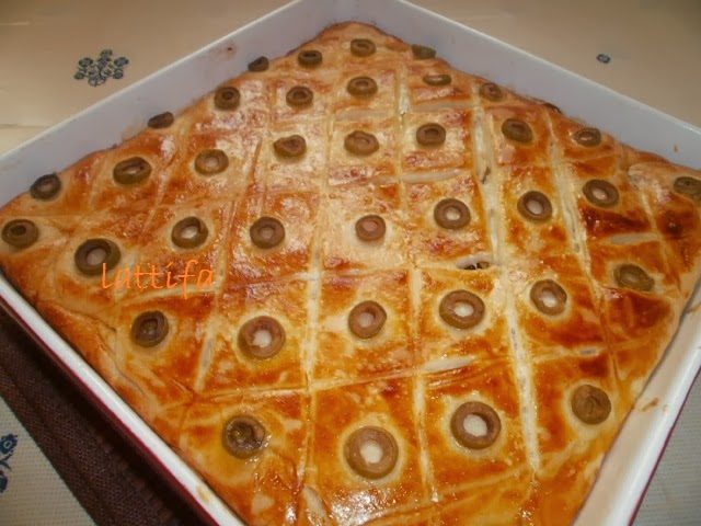 بالسكين ارسم ولا اقطع مربعات البقلاوة ..الرسم يكون من فوق وازين بالزيتون حلقات وندخلها للفران بلا ما نستنى تخمر ..خاصها طيب من تحت مزيان عاد تهبطيها باش تحمري الوجه
