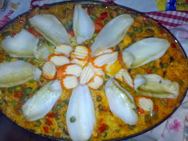 كناخدو شي إناء لي يقدر يدخل للفرن كنديرو فيه شوية زيت ثم البصلة و نخلوها تتقلى شوية ثم نضيفو الفلفل و نخلوهم يتقلاو ثم العطرية و الثوم و كنور ثم فواكه البحر نخلوهم يتشحرو مزيان ثم نضيفو جلبانة و الروز و شي نصف كأس من صلصة الطماطم أو ملعقة ك مطيشة الحك محلولة في شوية الماء ثم نضيف الروز ونحرك جيدا ثم نديرو الماء ( كل كأس روز كندير ليه 2 كيسان ماء ) ونخلوه يغلى عاد ندخلوه الفرن لي سخناه من قبل نخلوه حتى ينشف من الماء وندوقو الروز إلى كان مزال خاصو الطياب نزيدو شوية الماء غليان ملي إيطيب الروز ديالنا نضيفو ليه شرائح السمك و السوريمي ونرجعوه للفرن واحد 5 دقائق بينما طاب السمك لي درنا ثم نخرجوه من الفرن ونزينوه بقطع الفلفل لي قليناها نخليكم مع الصور :
