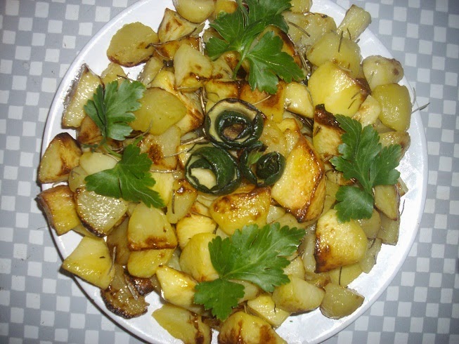 ناخذوا بطاطا تقطع شكل فريت نرقدوها في الماء والخل مدة 10 دقائق ثم تصفى وتنشف بالورق النشاف ثم ندهنوها بالزيت وندخلها الفرن شاعل من فوق ولتحت