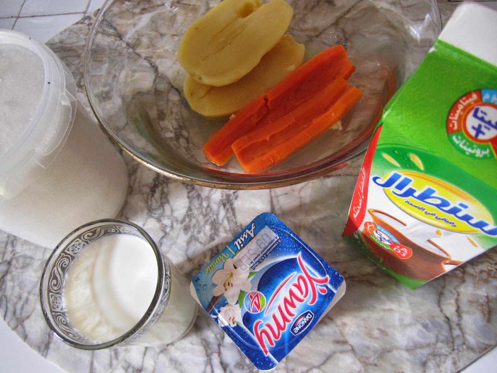 نصف لتر لبن – 1 دانون فاني – كاس حليب – حبة بطاطا مسلوقة – حبة جزر مسلوقة