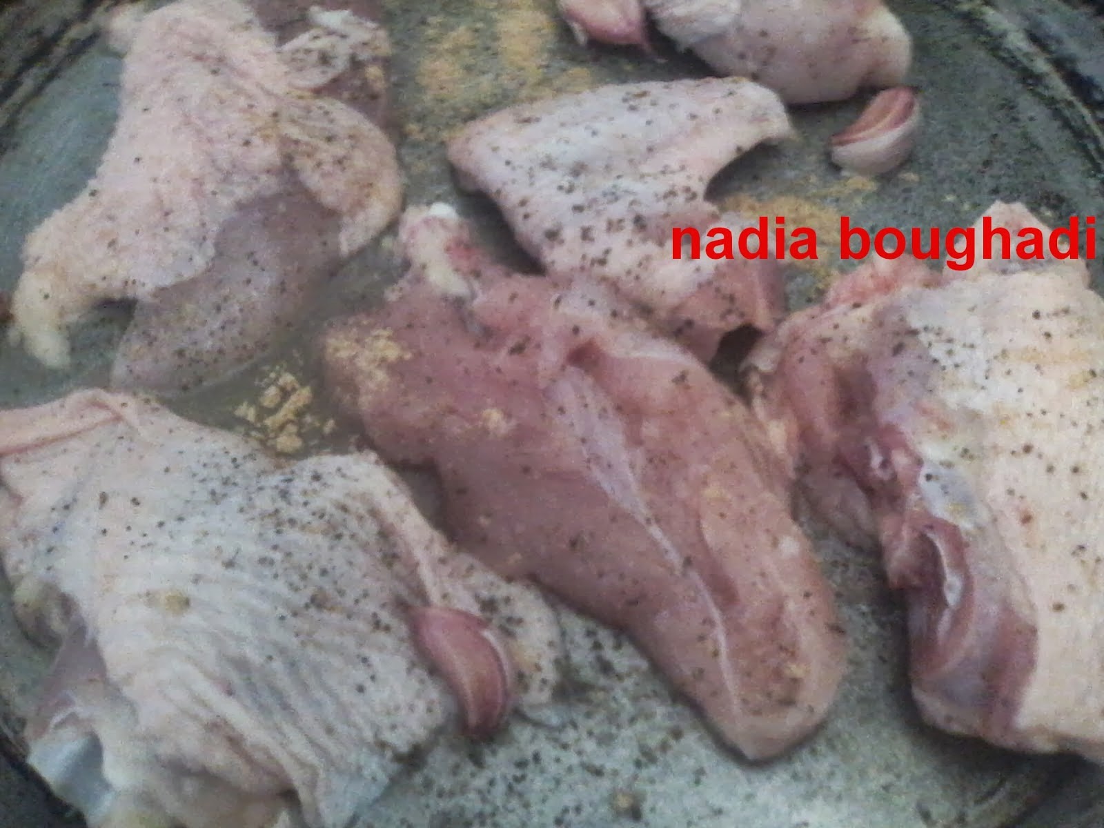 ناخد الدجاج ونضع عليه الفلفل الاسود والزنجبيل والملح تم نضعه فى صاج للفرن تم نضع عليه التوم والزيت